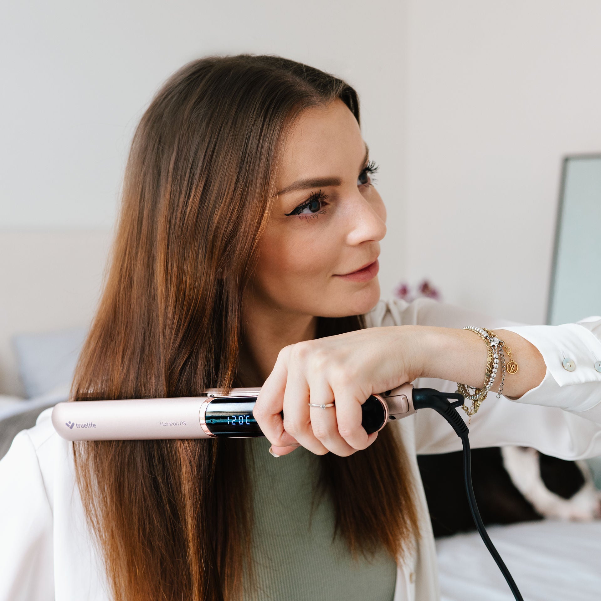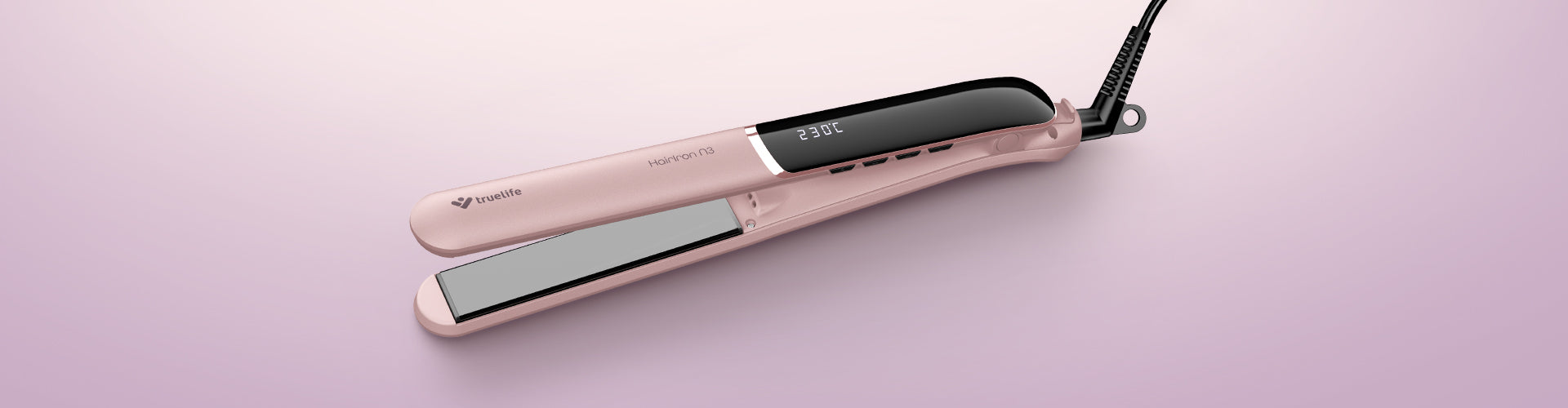 Discover the TrueLife HairIron N3 flat iron with a large LED display that offers fast and natural styling. Thanks to the rounded edges, you can not only straighten your hair but also create waves. The ceramic plates ensure even heat distribution and protect hair from damage, while the ioniser with TrueLife UltraIonic® technology adds shine and accelerates styling at lower temperatures.